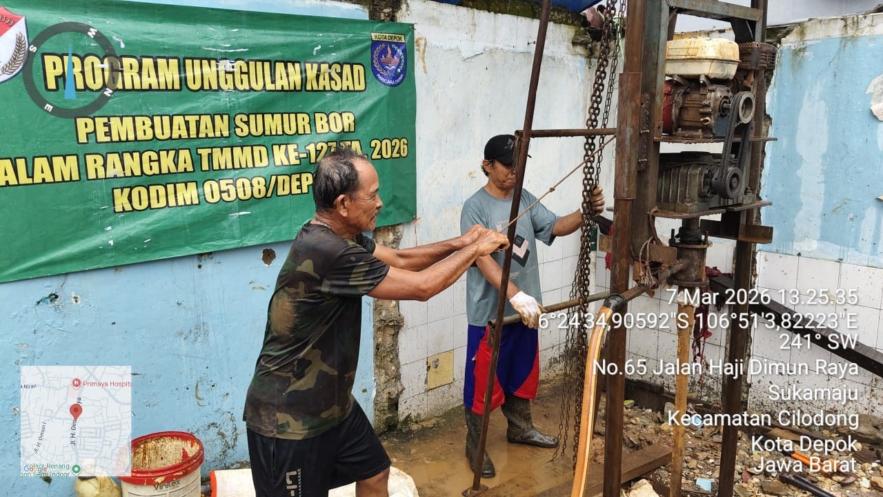 Untuk pembuatan Sumur Bor II yang berlokasi di Masjid Jami Al Mujahidin, Jalan H. Imun Raya RT 03 RW 24, Kelurahan Sukamaju, Kecamatan Cilodong, progres pengerjaan telah mencapai sekitar 67 persen.