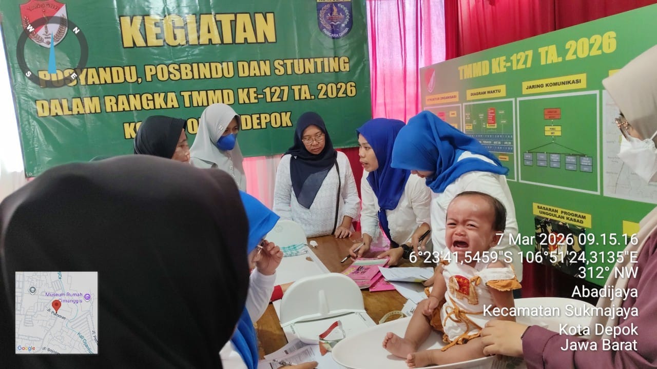 Memasuki hari ke-25 pelaksanaan TMMD, Satgas TMMD melaksanakan kegiatan program stunting, Posyandu dan Posbindu sebagai bagian dari sasaran non fisik. Kegiatan tersebut berlangsung di Jalan Pamoras, Kampung Bojong Lio, Kelurahan Abadi Jaya, Kecamatan Sukmajaya, Kota Depok. Sabtu (7/03/2026).